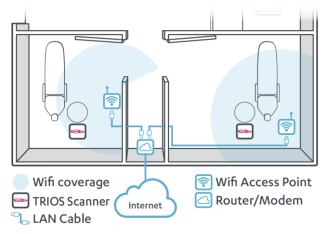 Trios er avhengig av å ha god og rask nettverkstilkobling hele tiden når maskinen er skrudd på. Det er derfor anbefalt å ha Wi-Fi router/AccessPoint/Mesh node i samme rom som Trios brukes. Hvis samme Trios skal brukes på flere behandlingsrom, er det anbefalt å ha et eget Wi-Fi punkt på hvert rom.