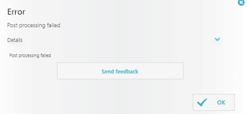 Etterprosesseringen kan feile med følgende (eller lignende) feilmeldinger: