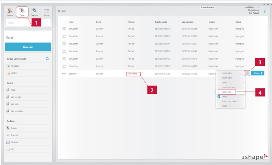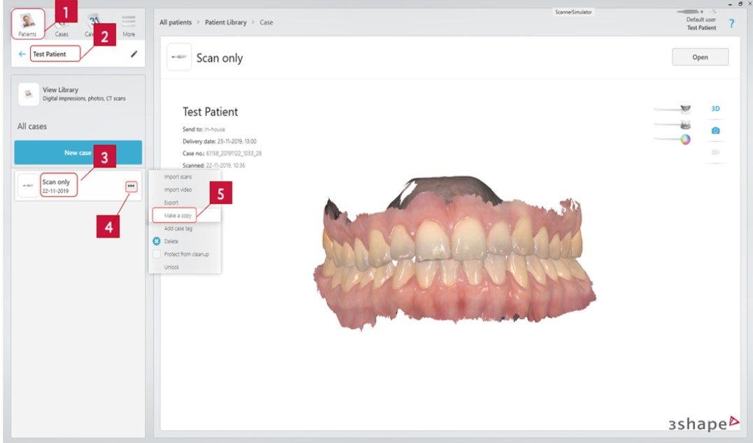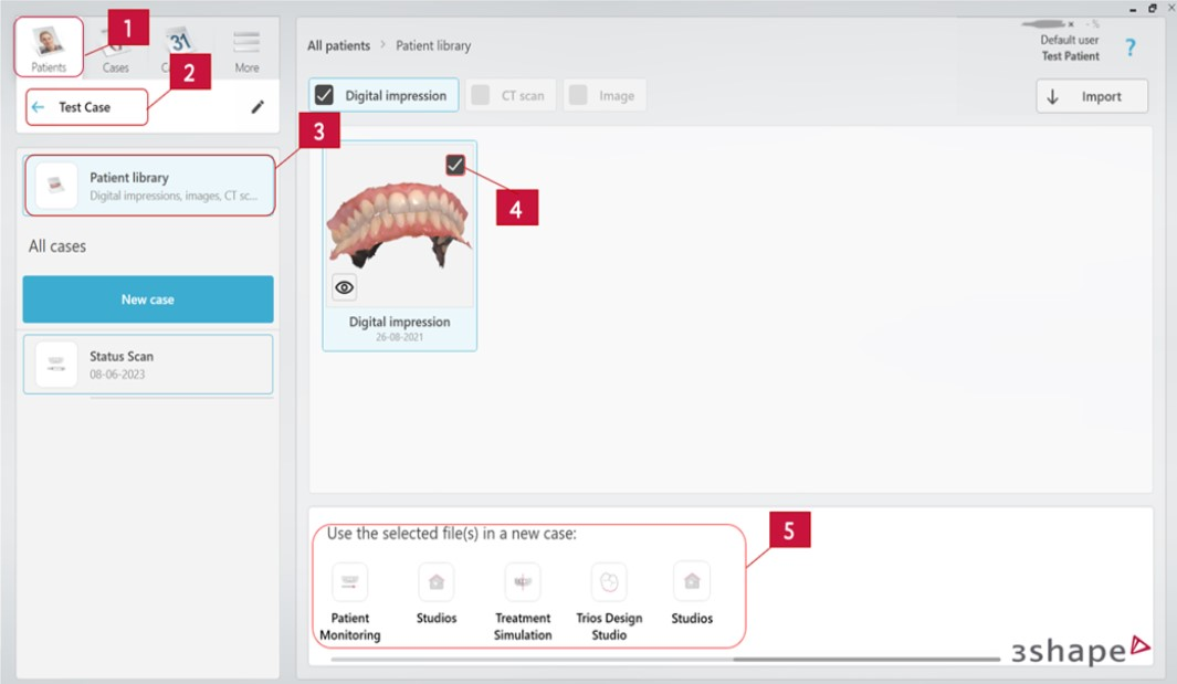 3. Hvis kun skanningene skal gjenbrukes: Gå til Pasienter → finn riktig pasient → i hovedmenyen finner du pasientens bibliotek → velg ønskede skanninger → nederst vil du få forslag til arbeidsflyter og laboratorier som er kompatible med de valgte skanningene/filene.